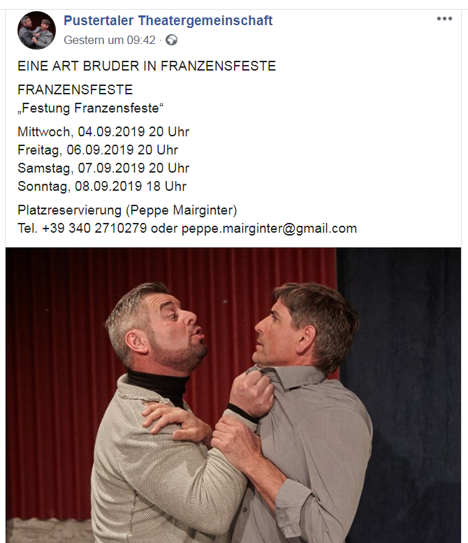 Anfang September zeigt die Pustertaler Theatergemenschaft noch einmal das Theaterstück EINE ART BRUDER – dieses Mal in Franzensfeste / Südtirol.